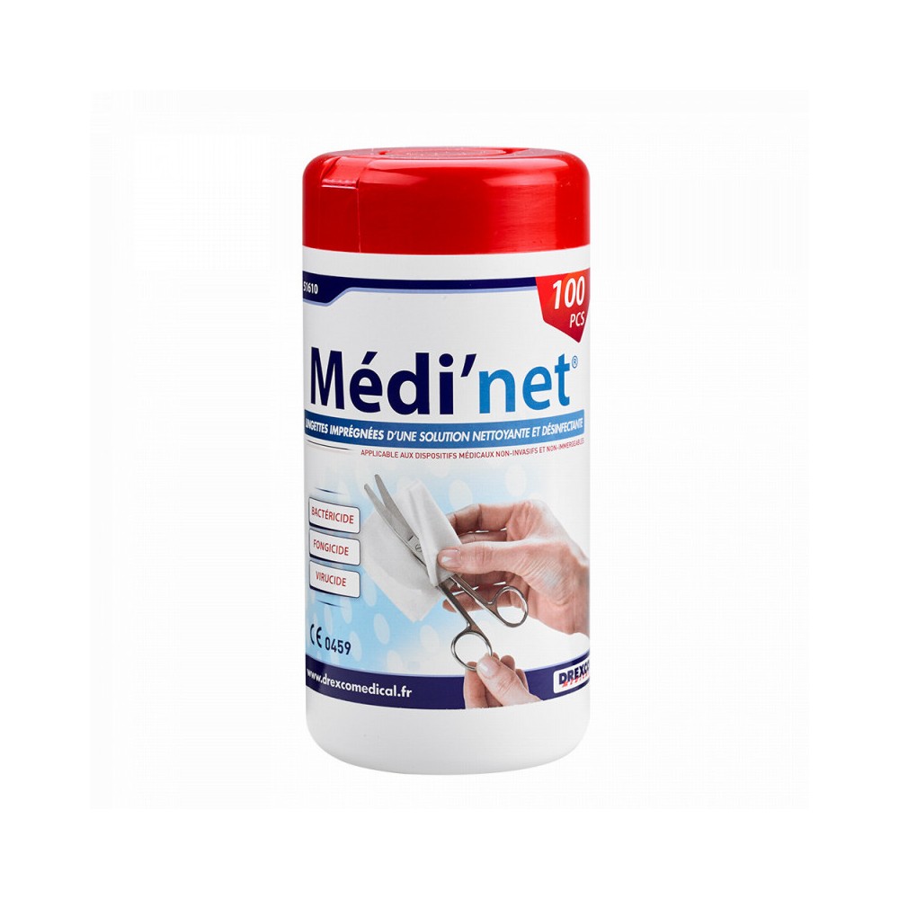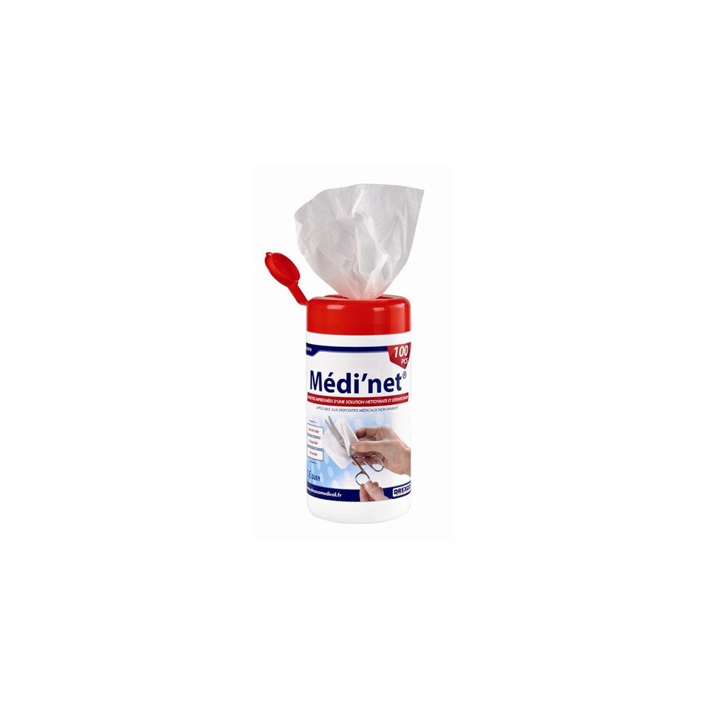- Lingettes désinfectantes Medi'net en non-tissées, imprégnées d'une solution nettoyante et désinfectante.