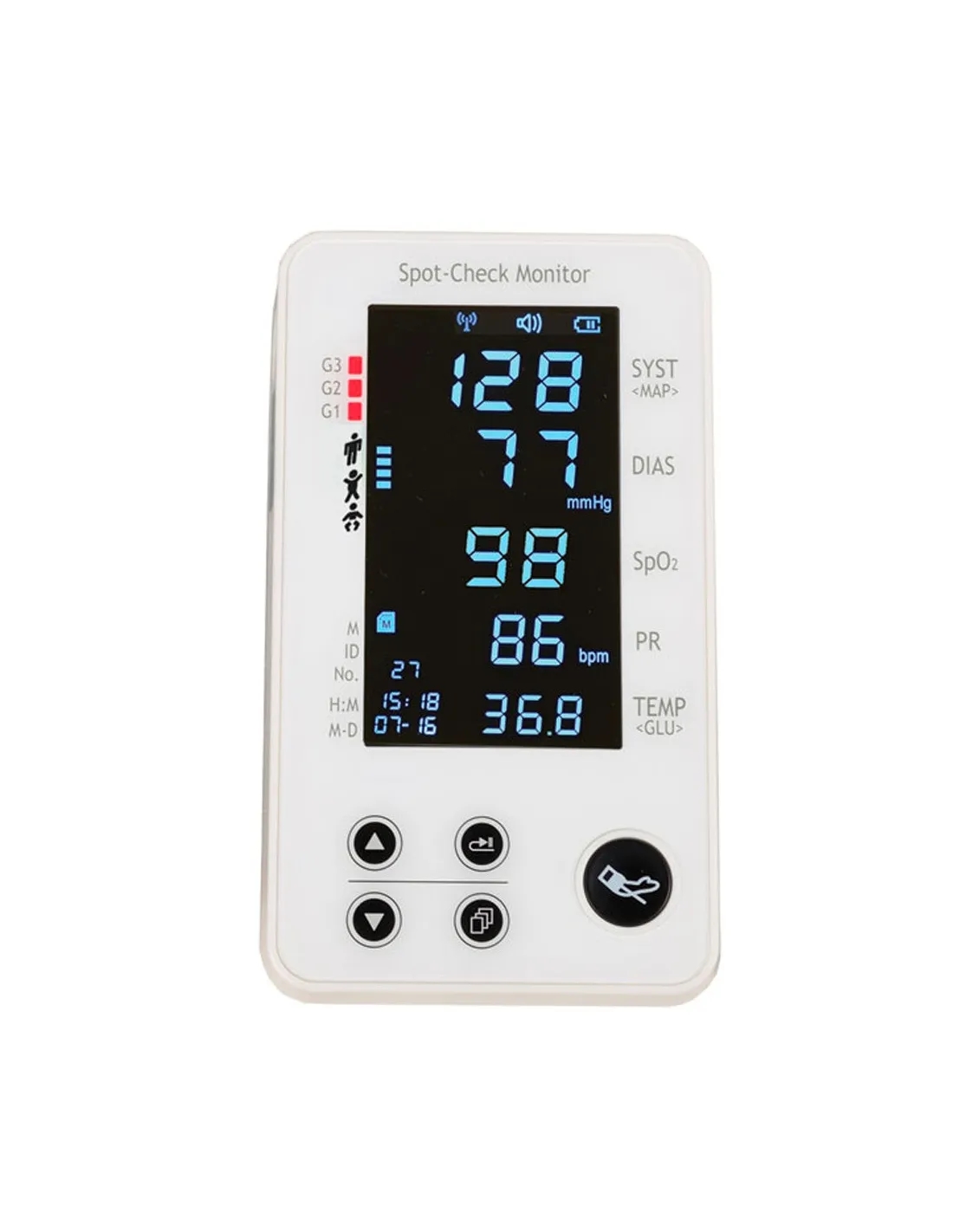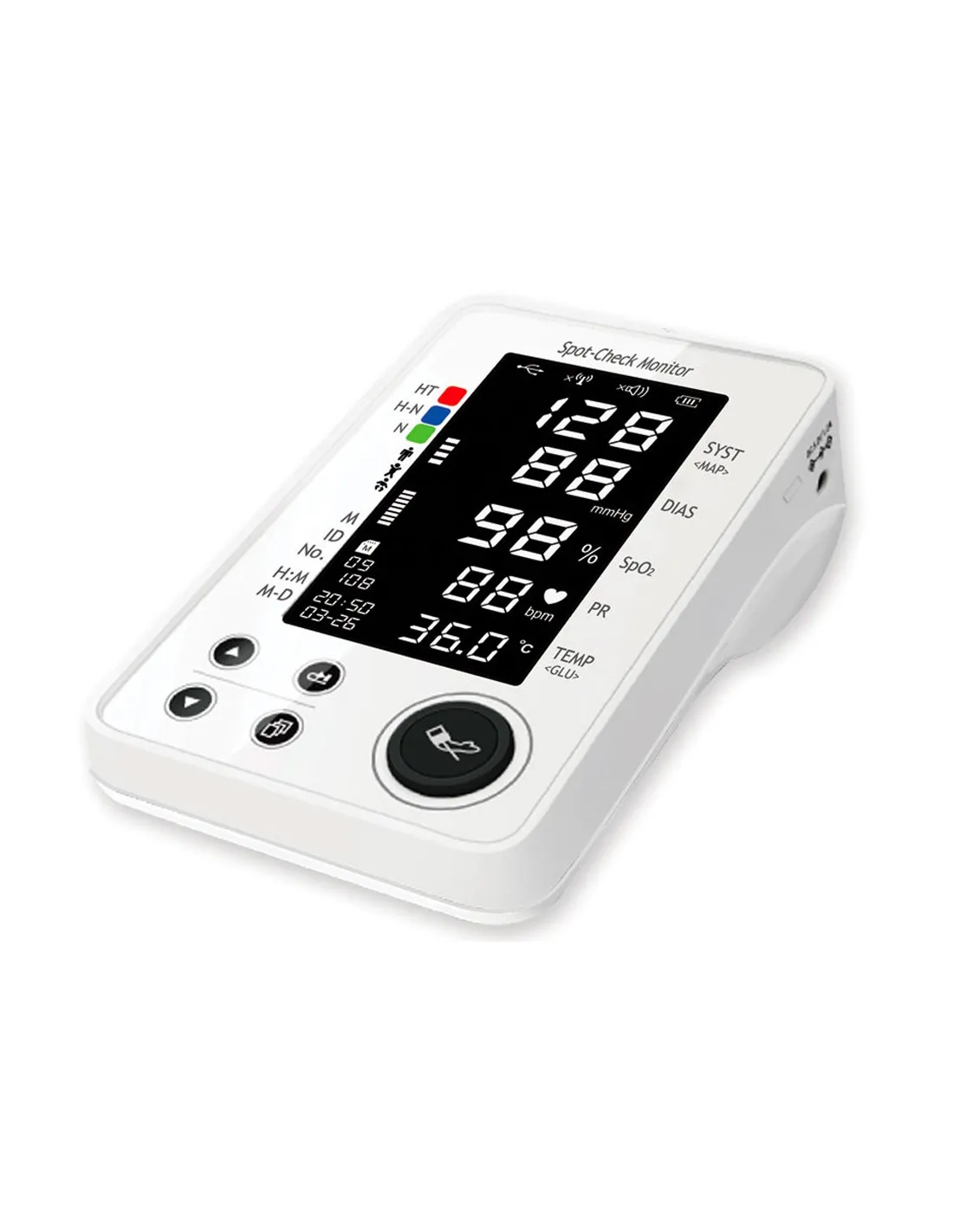 Station de diagnostic spot check pni spo2 temp a été conçu pour contrôler ponctuellement les paramètres physiologiques de l’utilisateur, tels que la pression artérielle non invasive (PNI), la saturation fonctionnelle en oxygène (SpO2), le rythme cardiaque (PR) et la température corporelle (TEMP).