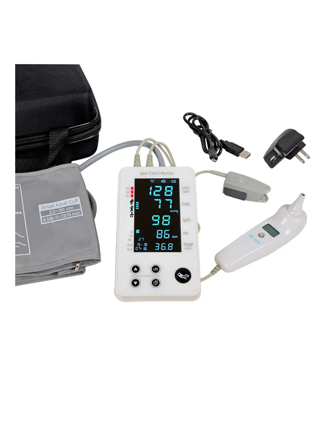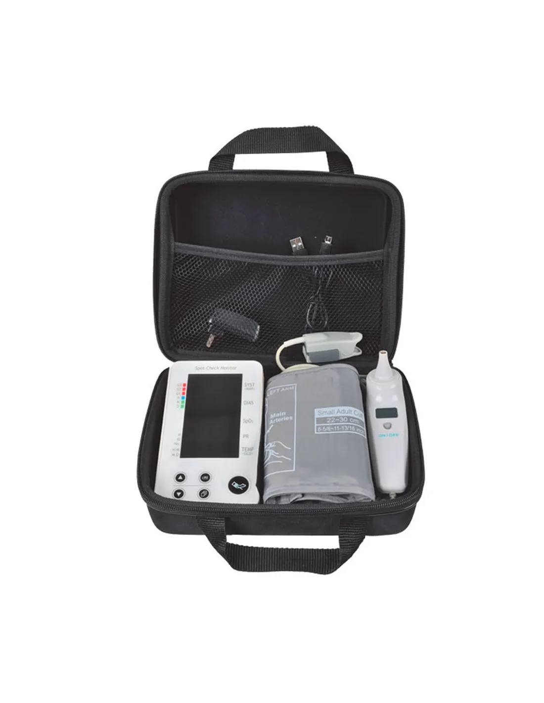 - Livré complet en étui rigide avec 1 Brassard adulte, un capteur SpO2 adulte et un thermomètre.