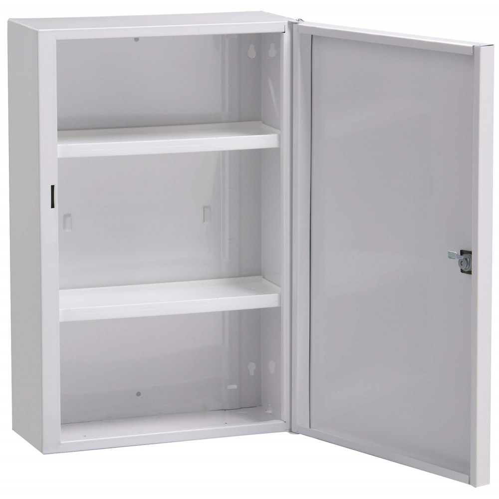 Armoire à pharmacie : corps, porte et étagères en acier poudré époxy, 2 étagères en métal.