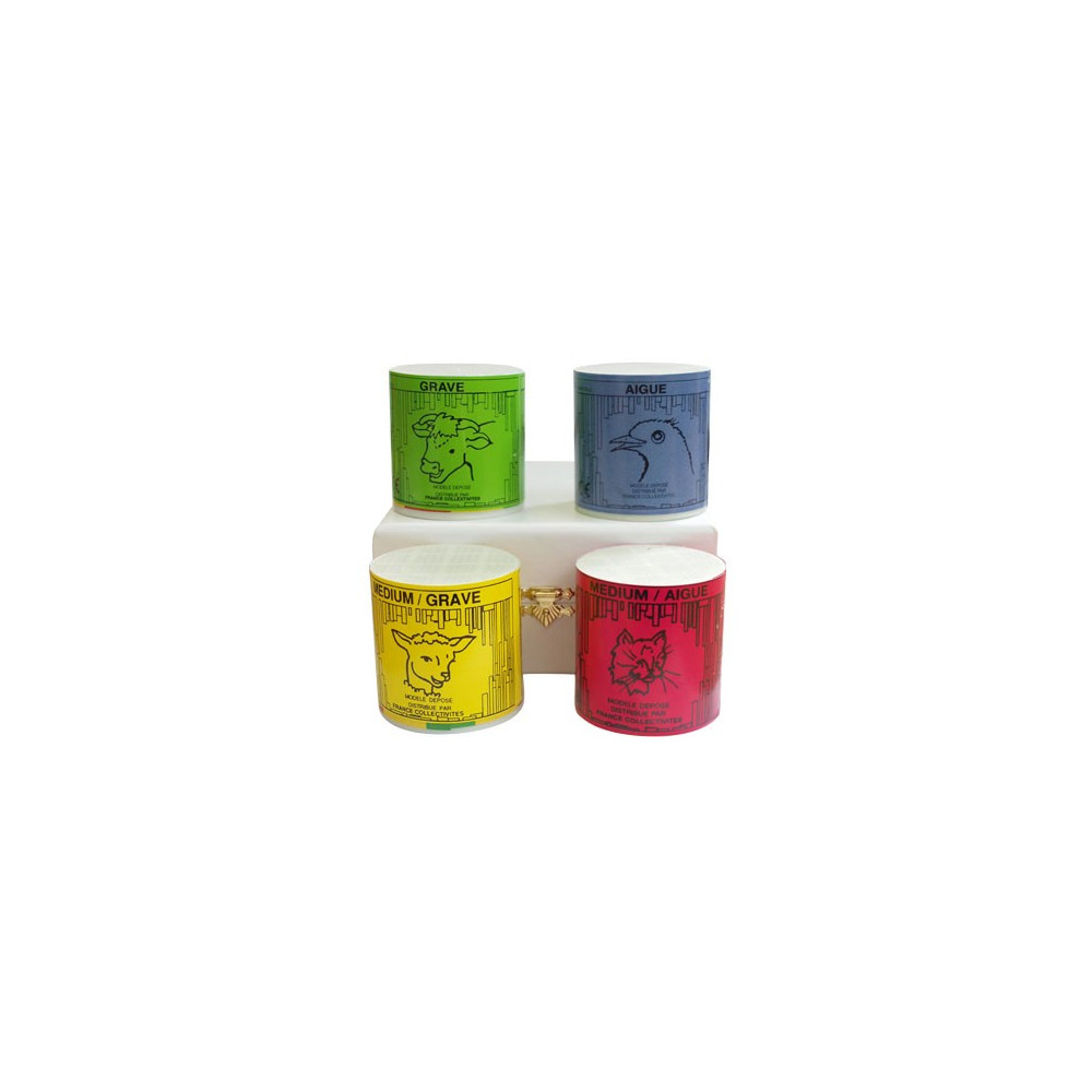 Coffret de 4 boîtes émettant des sons semblables à des cris d'animaux de fréquences différentes pour le dépistage de problèmes auditifs chez l'enfant.