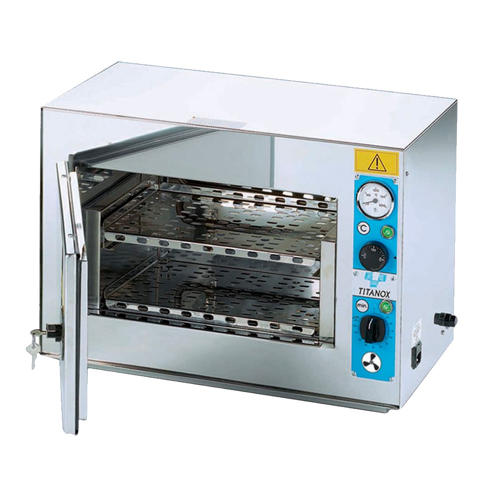 Le stérilisateur TITANOX utilise un système de chaleur sèche pour une stérilisation efficace. Sa structure interne ainsi que ses étagères réglables en hauteur sont entièrement conçues en acier inoxydable, assurant durabilité et hygiène.