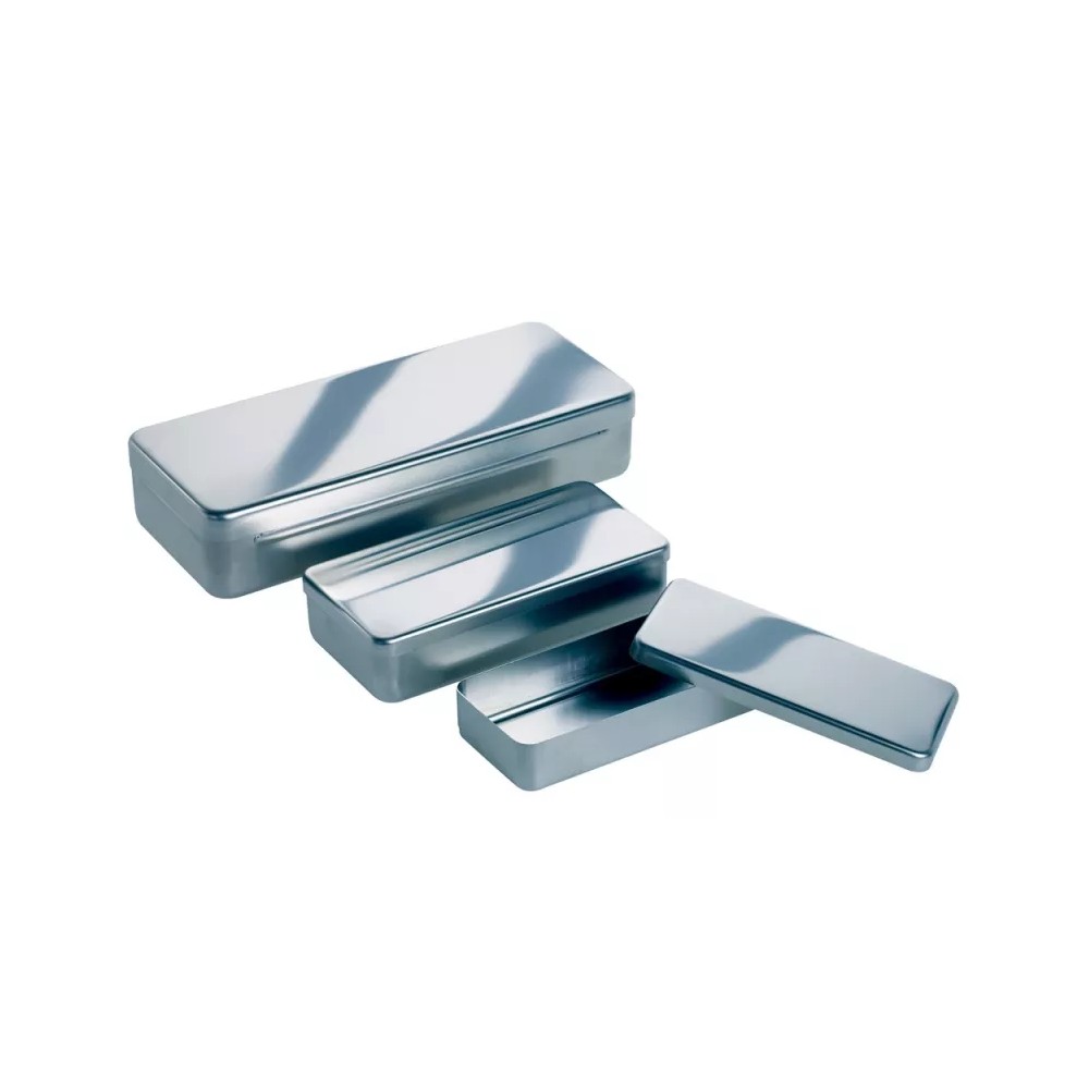 Boîte rectangulaire en acier inoxydable 18/10 de haute qualité, avec couvercle assorti, idéale pour la stérilisation et le rangement de votre instrumentation médicale.