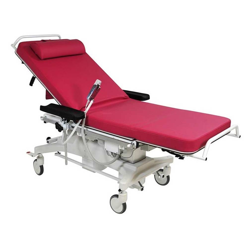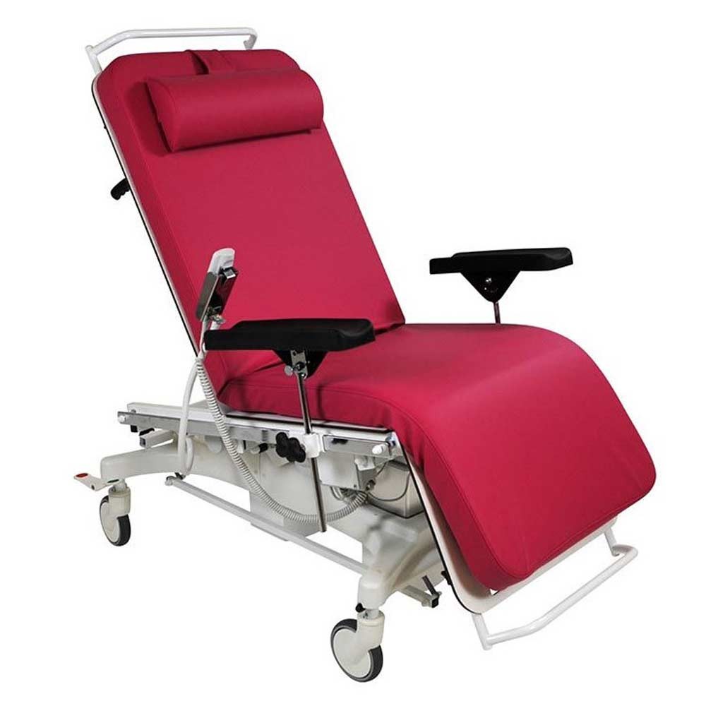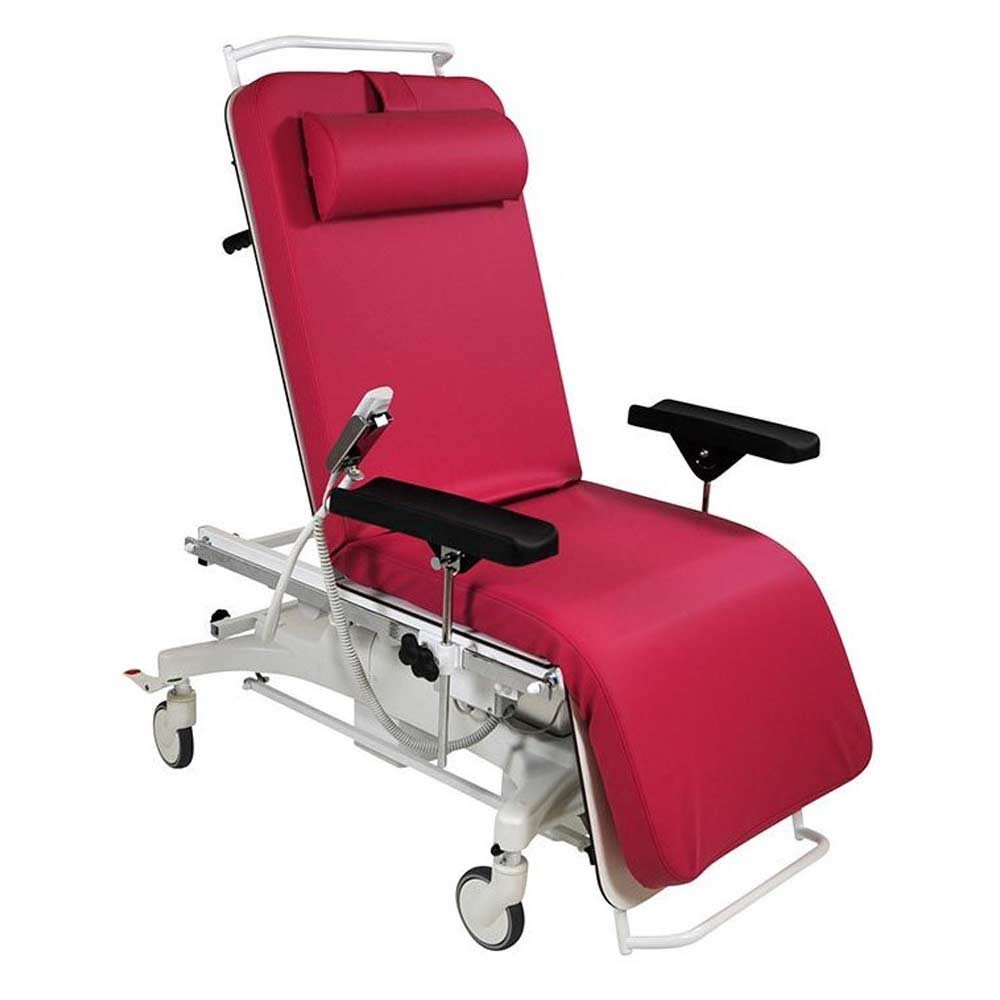Fauteuil en 3 parties pour prélèvement ou pour examen médical. Ce modèle peut se régler en hauteur grâce à la télécommande qui commande le dossier et la jambière.