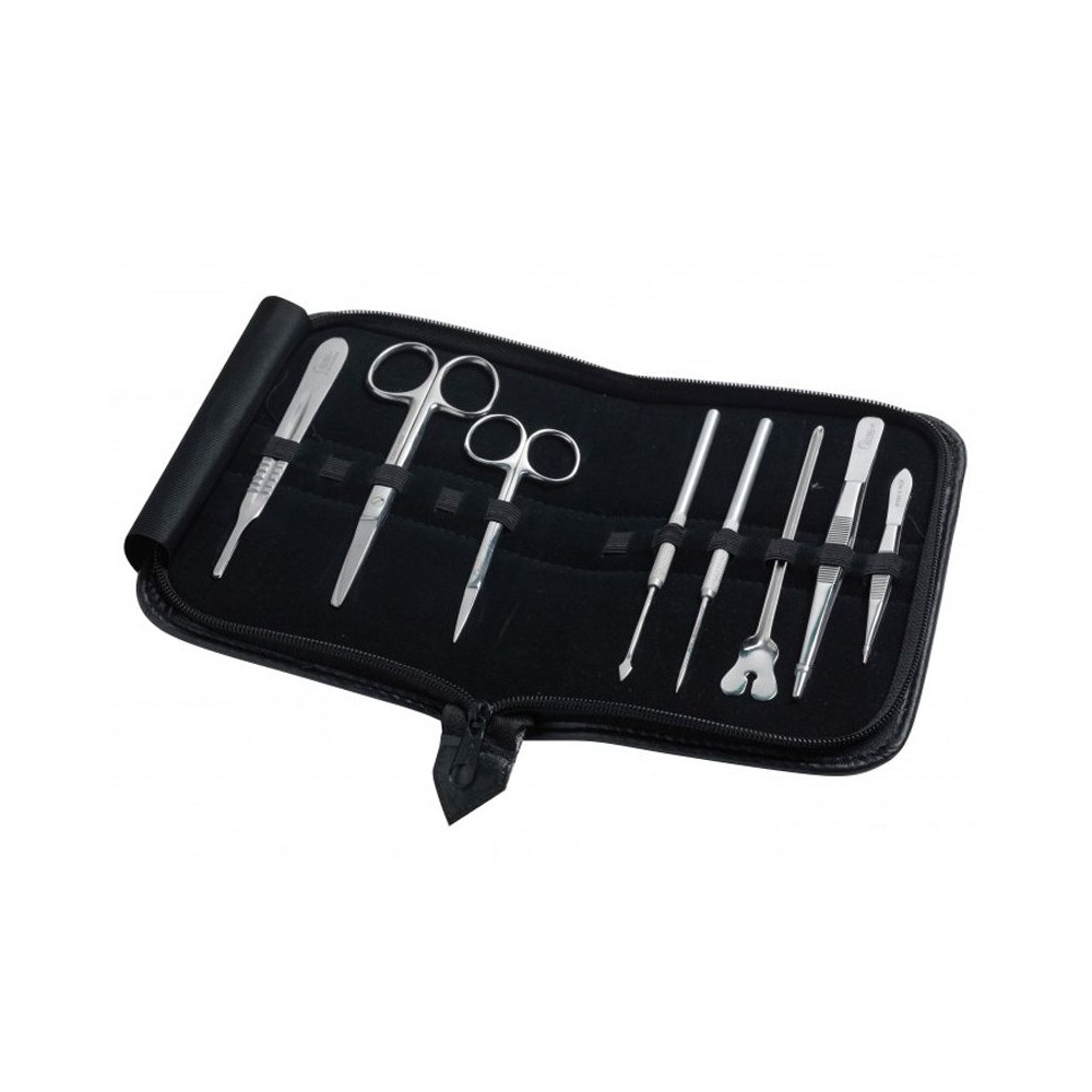 Trousse médicale complète avec tous les instruments nécessaires à la dissection.