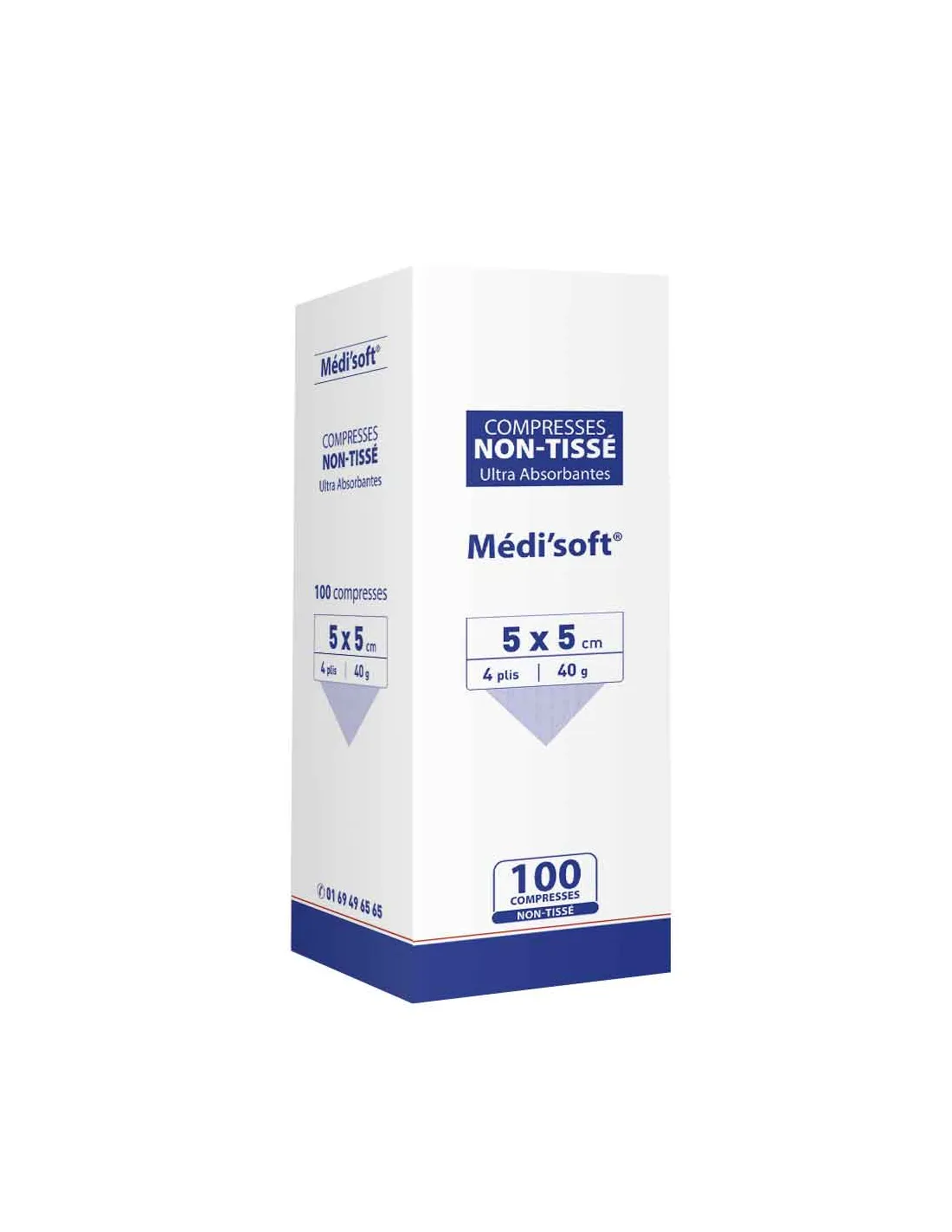 Les compresses sont en viscose et polyester non tissé 40 g/m² 4 plis pour le nettoyage et le soin des plaies.