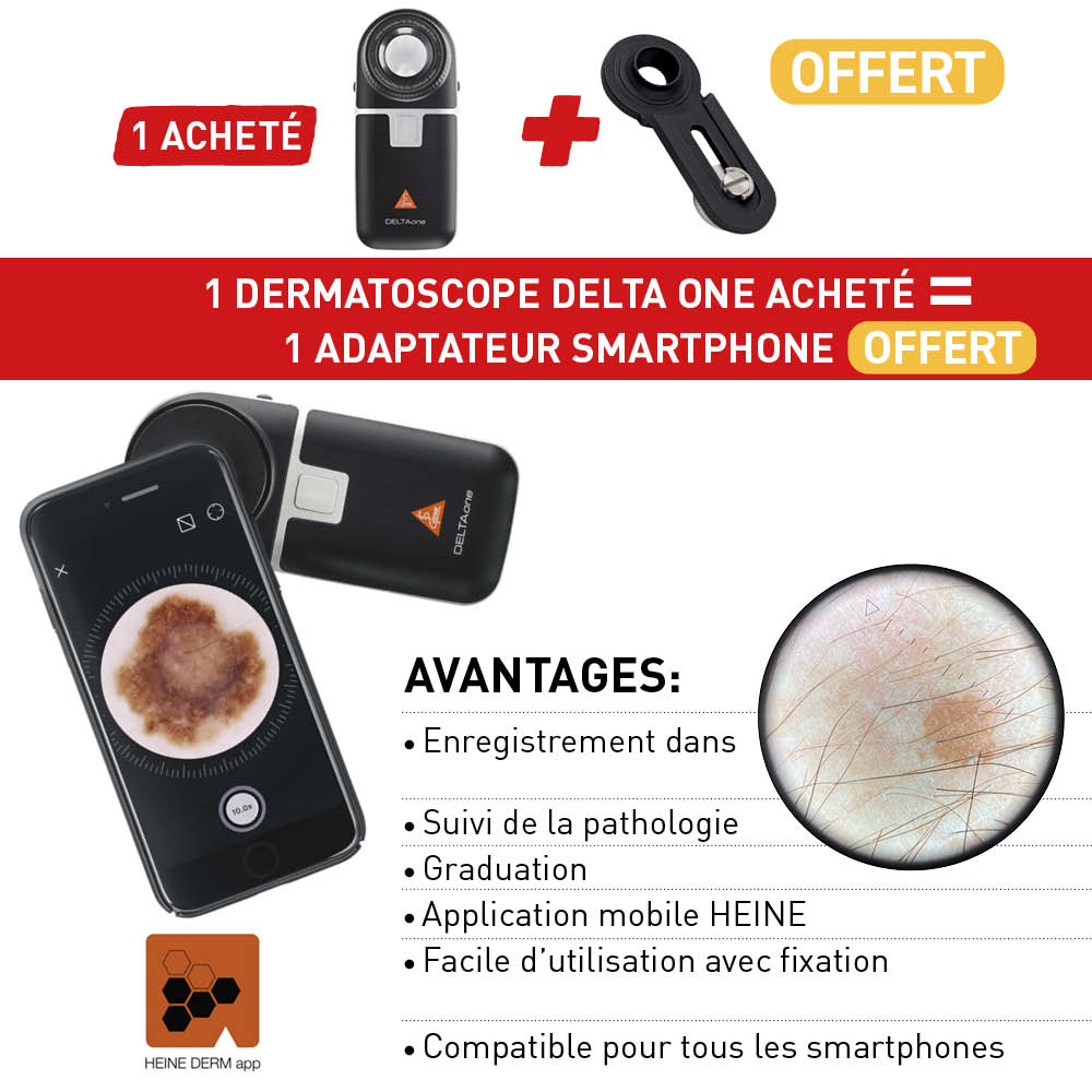Dermatoscope HEINE DELTA one + Adaptateur universel smartphone offertLe dermatoscope Heine DELTA one est un investissement judicieux pour les professionnels de santé qui recherchent un outil de diagnostic fiable, performant et polyvalent.