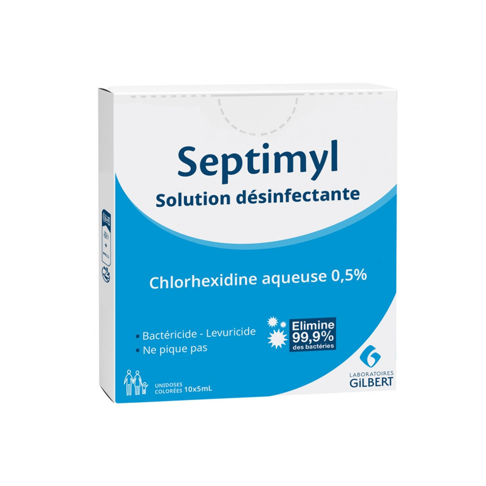 La Solution de?sinfectante Septimyl e?limine 99,9% des bacte?ries* pour une action de?sinfectante de la peau saine.