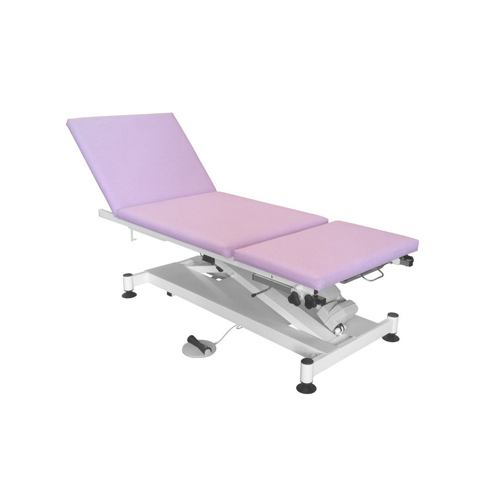 La table d'examen roye à 3 plans est réglable en hauteur grâce notamment à sa commande au pied. Le dossier et la partie centrale sont réglables par vérin à gaz. L'assise est relevable et réglable manuellement.