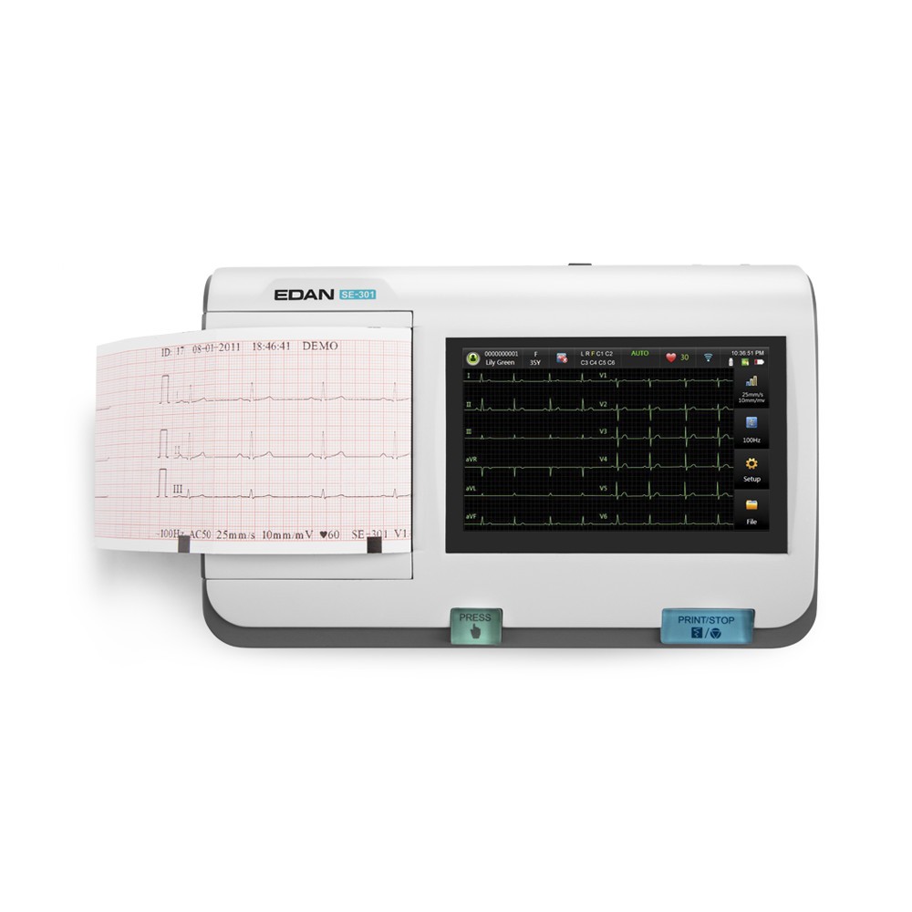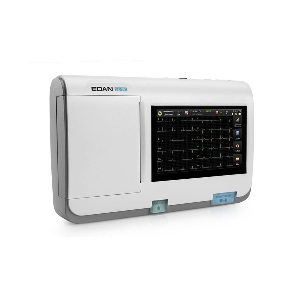 Le nouvel ECG Edan SE-301 est un électrocardiographe 3 pistes avec écran tactile couleur. Son écran 5 pouces (800 x 600 mm) est lisible et pratique.