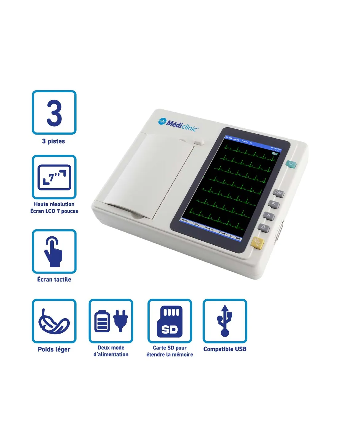 L'ECG CARDIO BETA 3 pistes propose un écran tactile LCD couleur de 7 pouces affichant jusqu'à 12 pistes simultanées. Sa mémoire peut stocker les données de jusqu'à 30 000 patients. L'appareil est équipé d'une batterie rechargeable Li-ion offrant une grande autonomie. Certifié Classe I - CE, il dispose de ports carte mémoire micro SD / USB. Pesant 1.2 kg et mesurant 25 x 20 x 4.5 cm, il est garanti 2 ans. Cet ECG est idéal pour les professionnels de la santé pour un diagnostic précis et rapide.