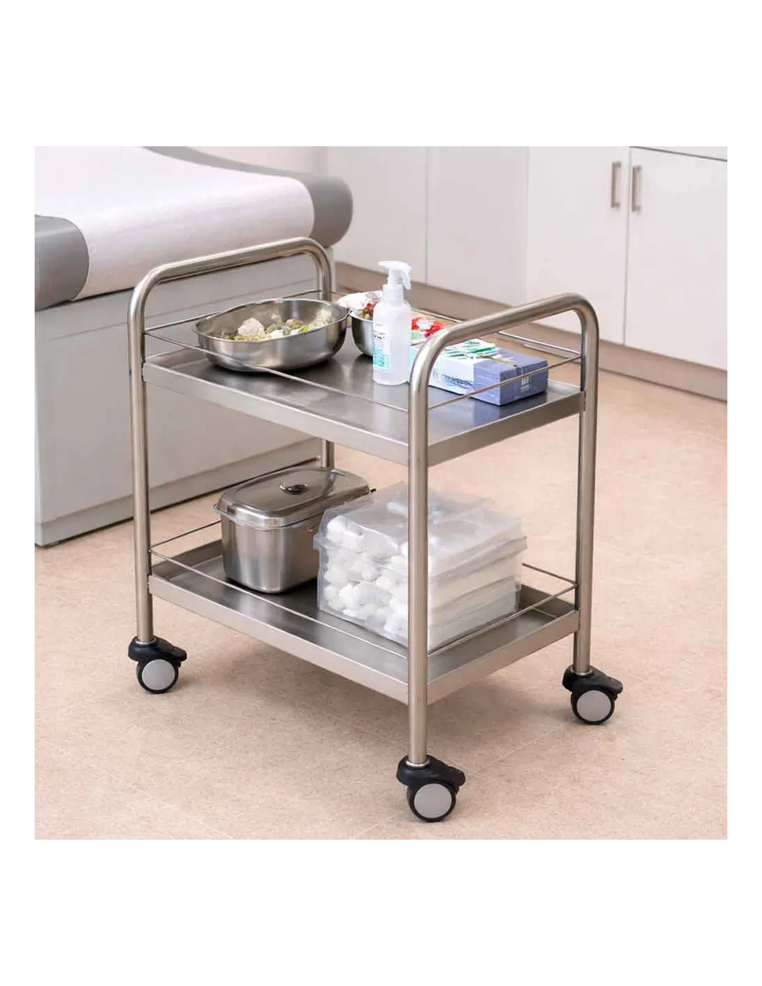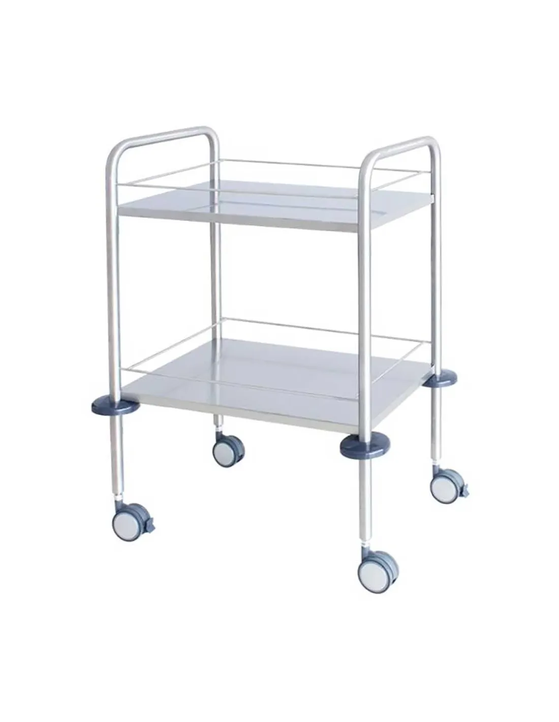 L'atout majeur de ce chariot de soin réside dans sa conception "tout inox". Contrairement aux modèles en époxy ou plastique, l'acier inoxydable ne craint ni l'humidité ni les détergents hospitaliers puissants. Cela en fait un équipement privilégié pour les environnements où l'asepsie est critique. Les deux plateaux offrent un rebord sécurisant et une surface plane parfaite pour la préparation des soins.