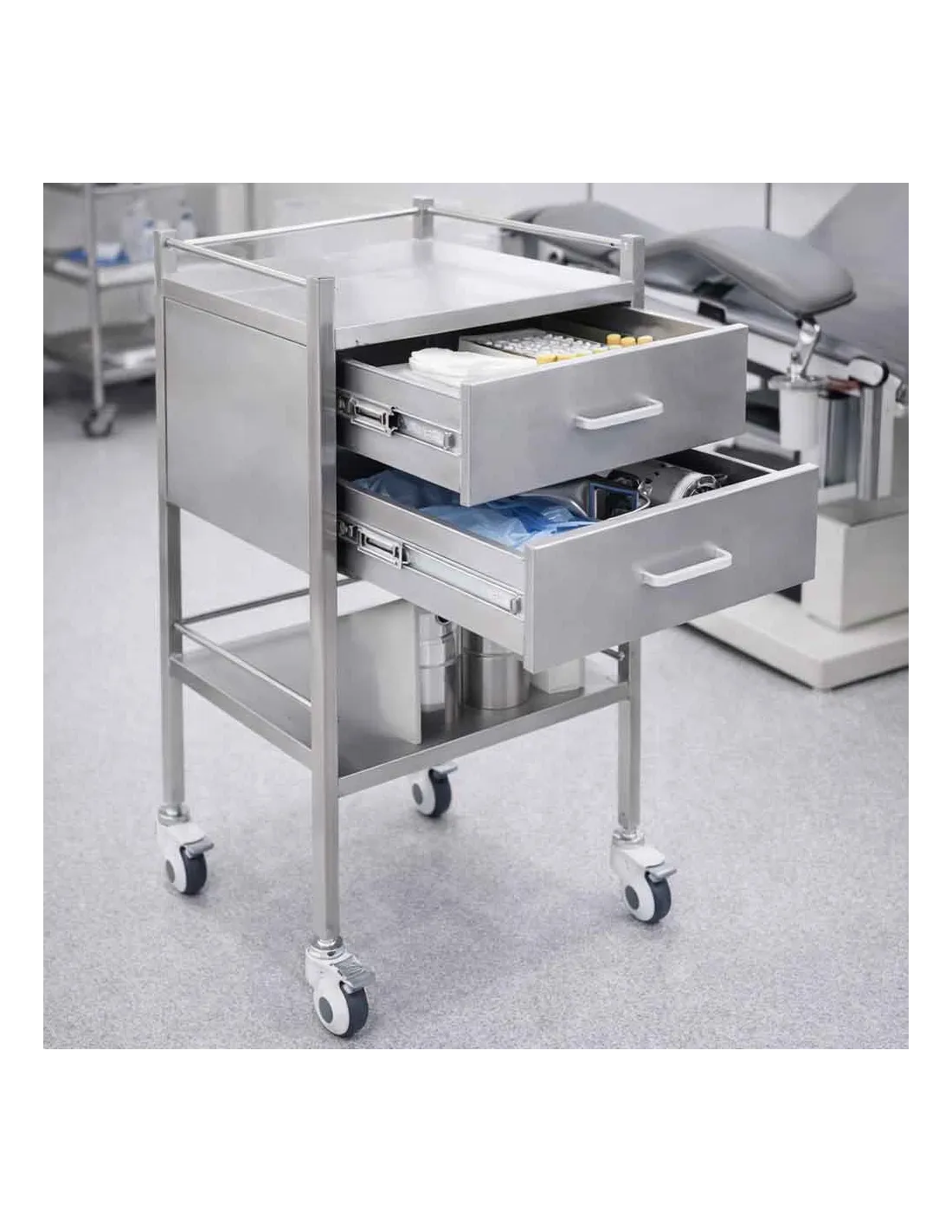 L'ergonomie a été pensée pour l'usage quotidien intensif. Les tiroirs coulissent facilement pour un accès rapide aux seringues, pansements ou petits outils de diagnostic. Le plateau supérieur, situé à une hauteur de 90 cm, offre un confort de travail optimal pour la préparation des soins en position debout, évitant ainsi les mauvaises postures dorsales pour le personnel soignant.