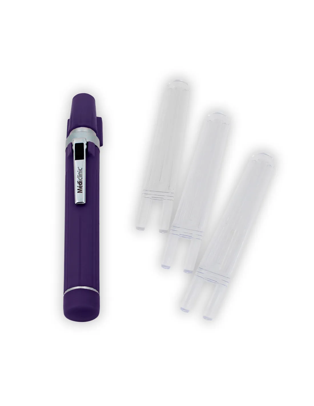 La lampe stylo porte-abaisse-langue LED violette complète parfaitement ce pack. Conçue pour les examens de la gorge et de la cavité buccale, elle offre un éclairage LED blanc précis et homogène, garantissant une excellente visibilité lors du diagnostic. Son format compact et son design discret en font un instrument parfaitement adapté aux professionnels de santé.