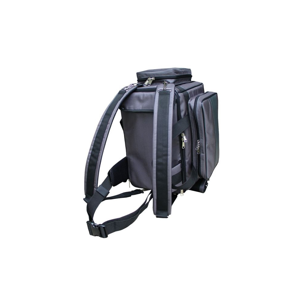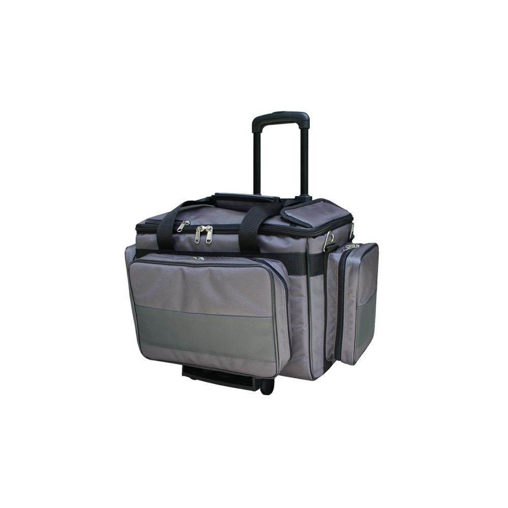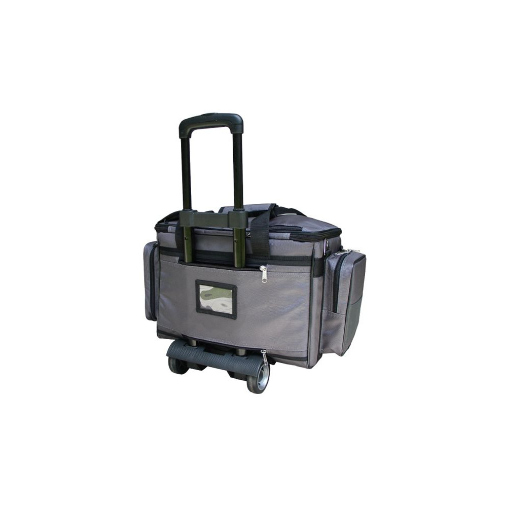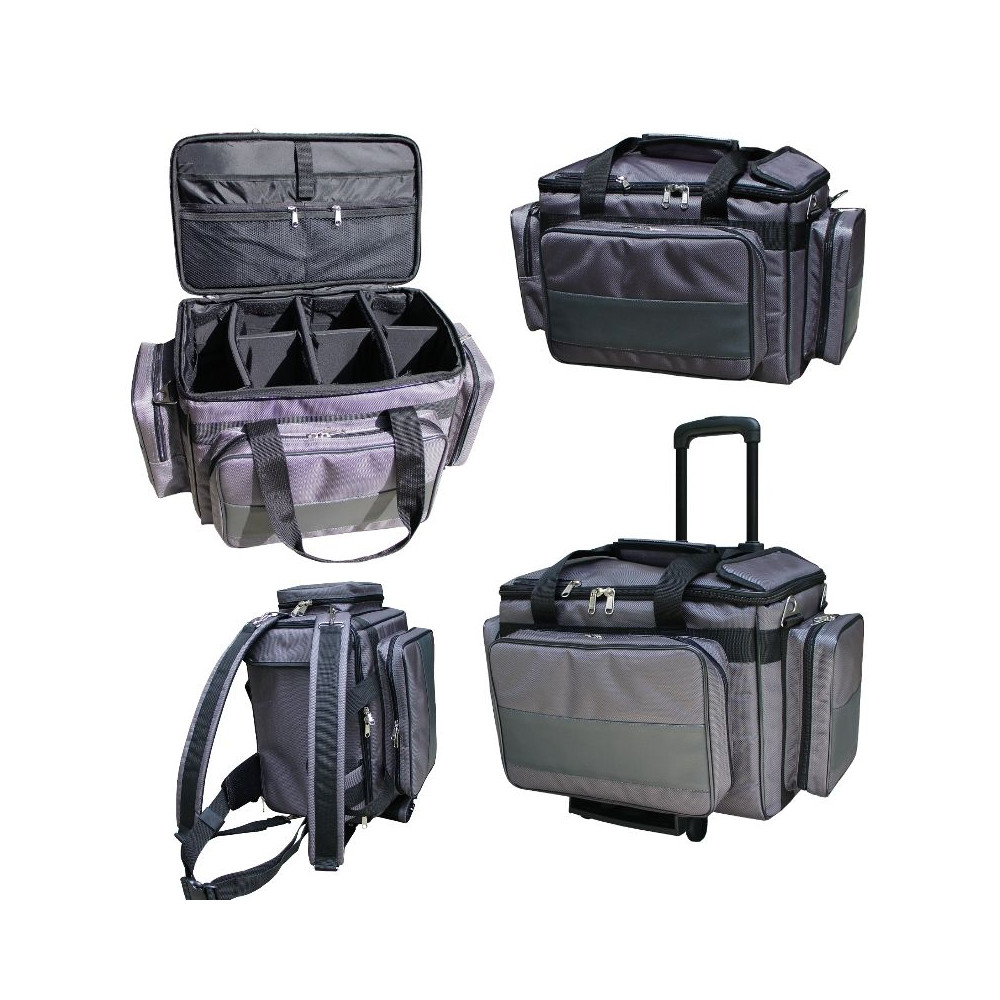 La mallette peut se porter en sac à dos (lanières renforcées fournies), en bandoulière ou à l'aide d'un chariot à roulettes trolley (en option). Un compartiment à fermeture éclaire est prévu pour l'insertion du montant du trolley.