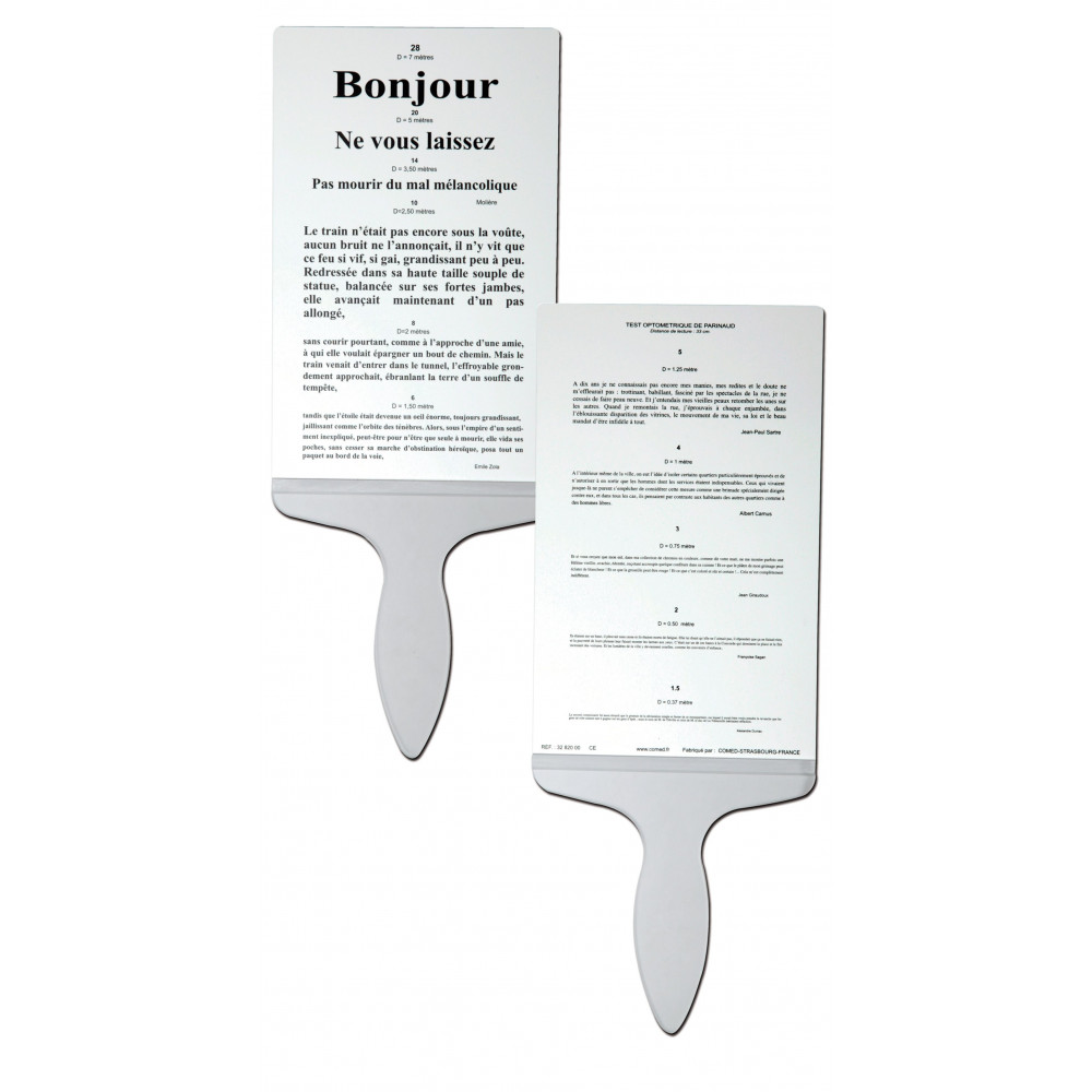 - Faites le test à bras tendu du patient à 33cm. Le test détermine la vitesse de lecture sans changement de distance, l’information donnée est plus qualitative que quantitative. Si vous devez déplacer vers l’avant ou l’arrière le test pendant la lecture ceci peut caractériser une myopie ou une hypermétropie.
