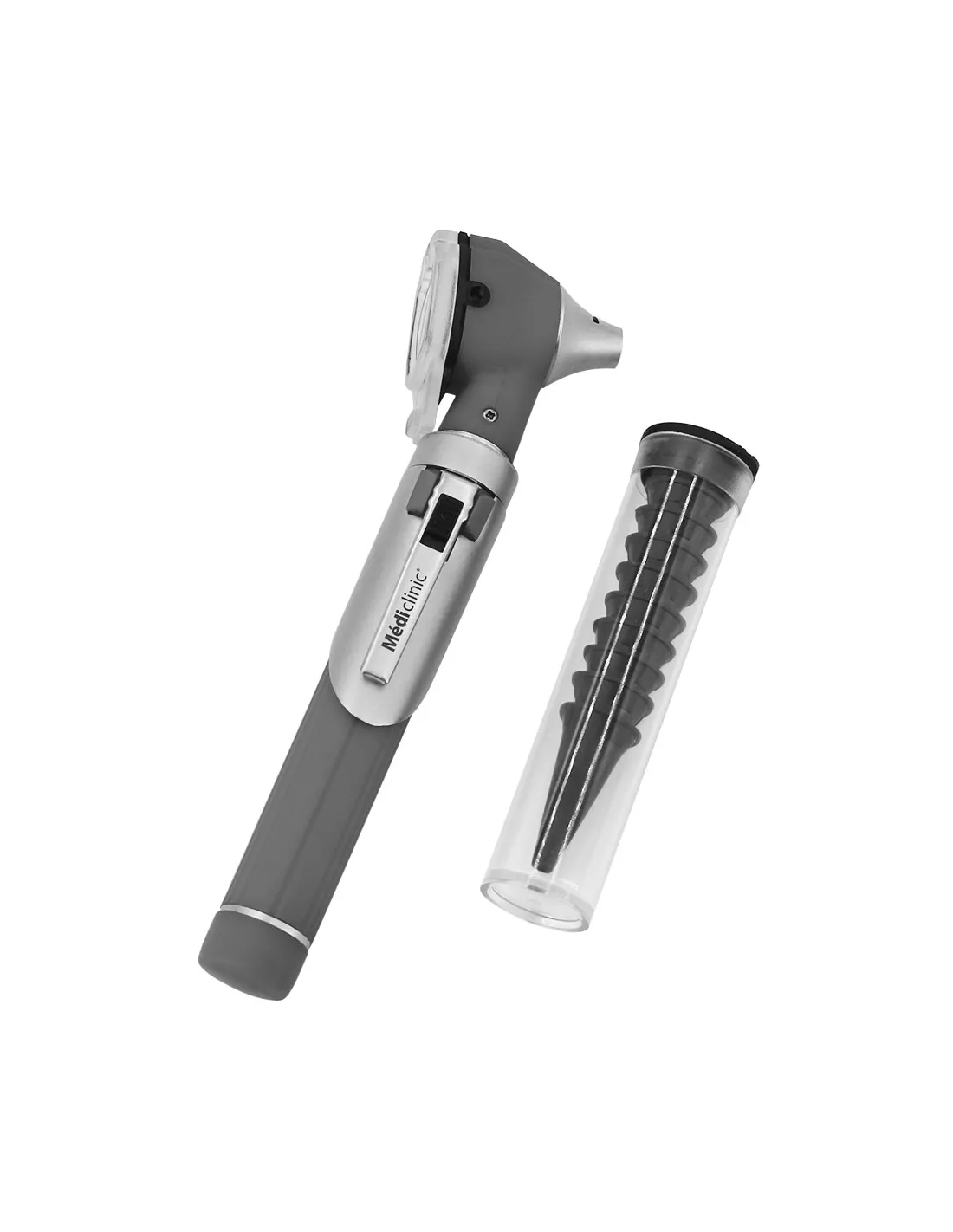 Chaque coffret contient un otoscope FO LED Médiclinic gris, un jeu de spéculums réutilisables, un étui souple de protection et une notice d’utilisation multilingue. Piles non incluses.