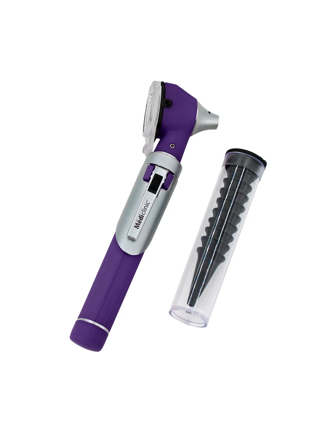 Chaque coffret contient un otoscope FO LED Médiclinic violet, un jeu de spéculums réutilisables, un étui souple de protection et une notice d’utilisation multilingue. Piles non incluses.