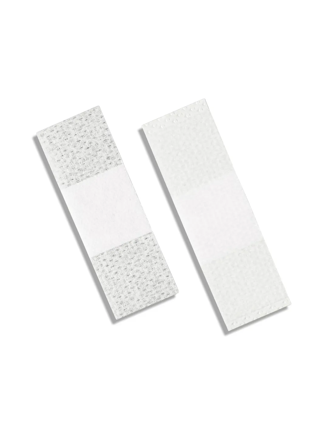 Le support très souple est un non tissé médical blanc. La colle est composée d'acrylique hypoallergénique. La compresse centrale est absorbante : elle protège la plaie sans la coller. Les bords du pansement sont droits.