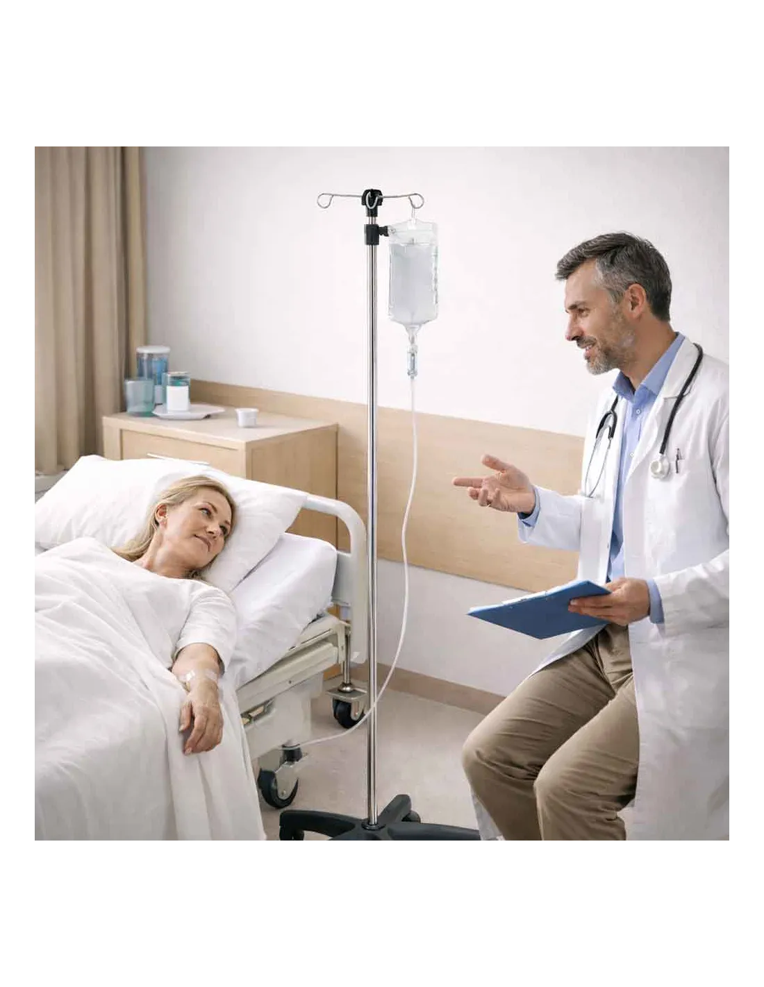 Le pied à sérum 4 crochets Mediclinic est un élément fondamental de l'équipement hospitalier, conçu pour accompagner le patient tout au long de son parcours de soin. Sa conception allie la légèreté nécessaire pour être manipulée par des patients affaiblis et la robustesse requise par les professionnels. La tige en acier inoxydable offre une rigidité parfaite, évitant les effets de balancier trop prononcés lors de la marche.