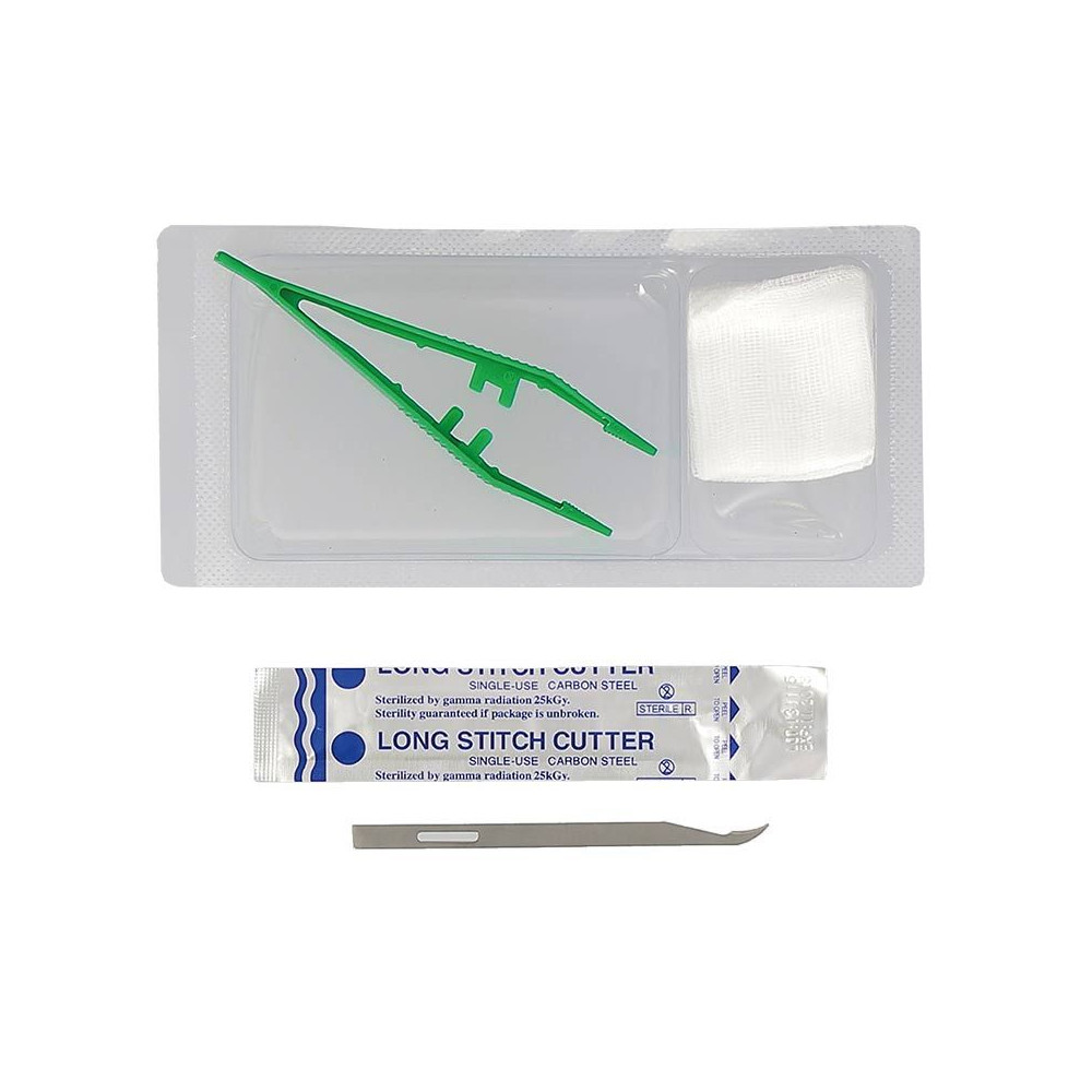 L'opérateur place dans l'une des alvéoles du blister la solution antiseptique. Il utilise les compresses pour l'antisepsie de la plaie suturée. La pince anatomique permet la préhension du fil ; ce-dernier étant coupé par la lame.