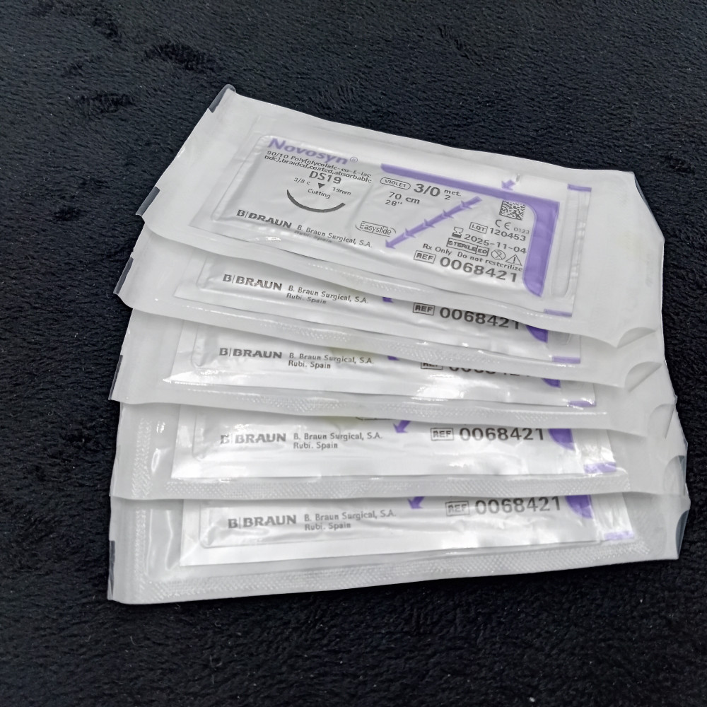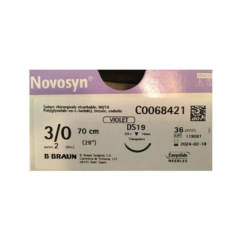Novosyn® est une tresse résorbable synthétique à base d’acide polyglycolique et d’acide L-Lactique dans la proportion 90/10, enduite, disponible en violet et en incolore.
