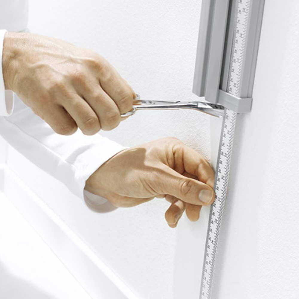 Peu importe la taille du patient : la toise pour enfant et adulte Seca 216 étant dotée d‘une échelle amovible graduée de 3,5 à 230 cm, elle permet de mesurer aussi bien la taille des enfants que celle des adultes. Le ruban gradué est inséré dans un profilé en matière plastique de 138 cm de long. L‘utilisateur décide lui-même quelle plage de mesure apparaît dans le profilé.