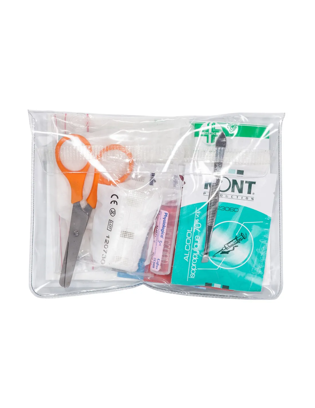 Pochette de secours individuelle plastique transparent, fermeture par adhésif repositionnable.