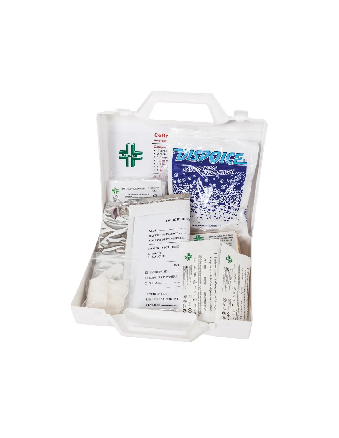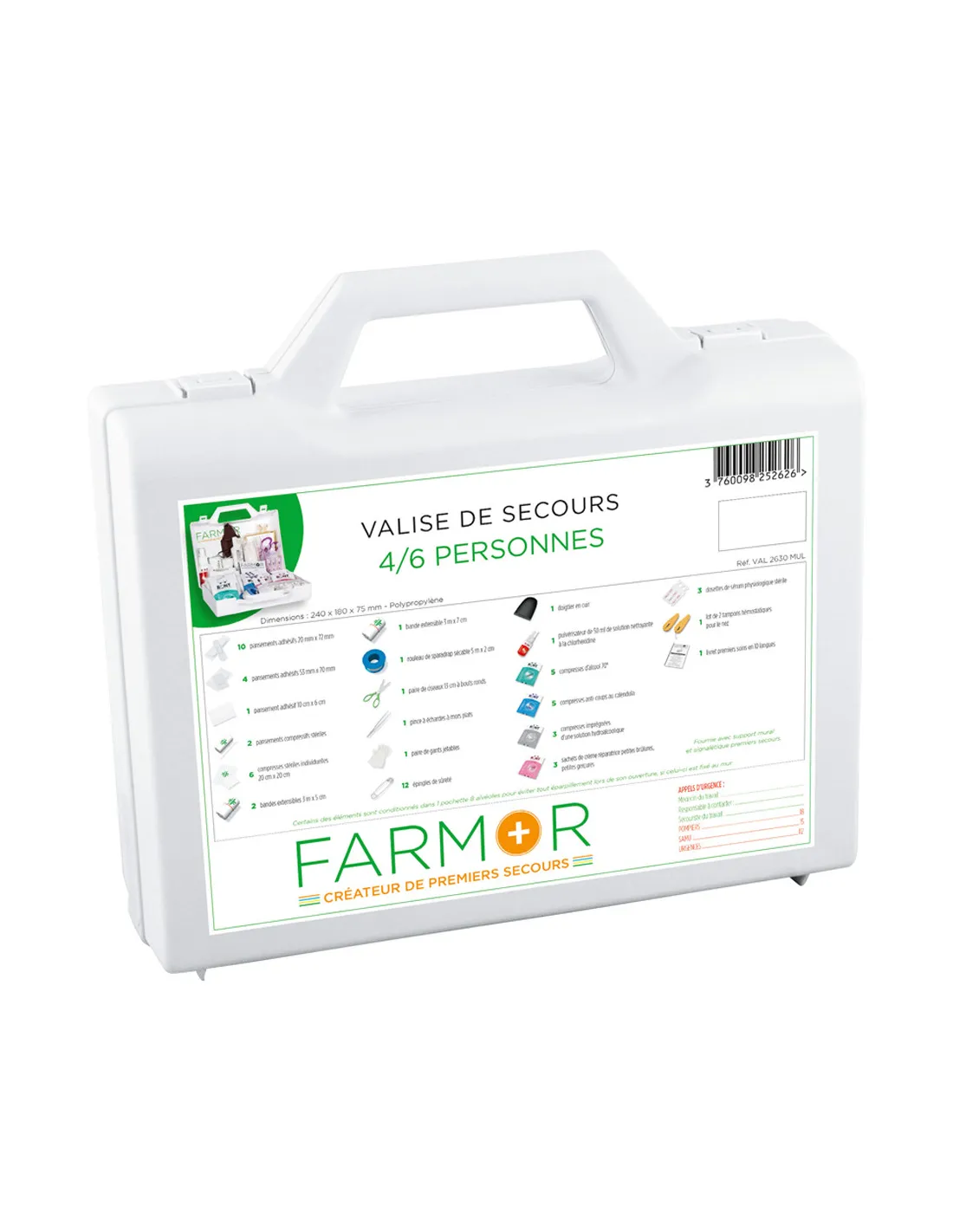 Valise de secours 4/6 personnes en polypropylène blanc avec poignée de transport.