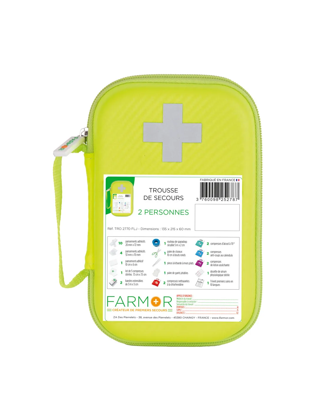 Trousse de secours deux personnes jaune fluo en matière semi-rigide légère, compacte et flashy.